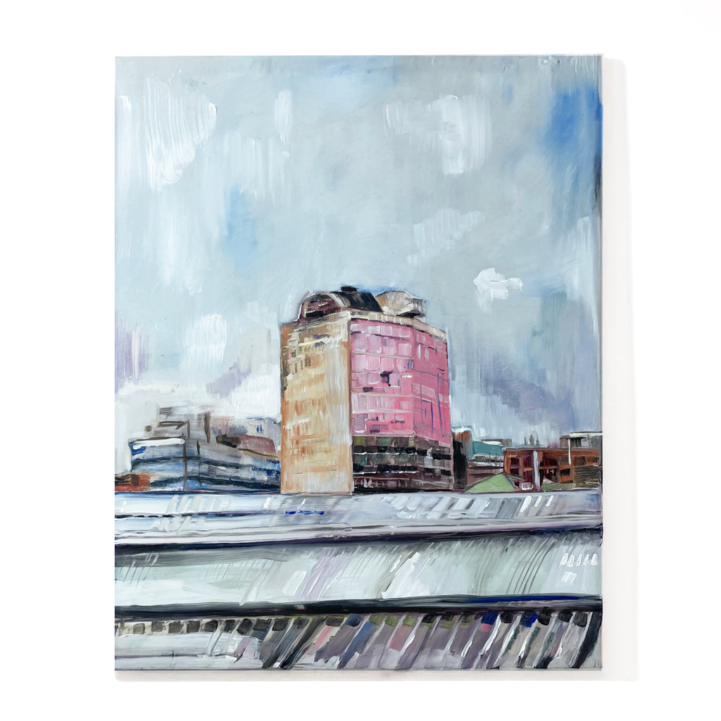 From my studio window, this painting captures the well-loved “People Make Glasgow” building. The once-vivid poster now fades across its facade, waiting for the city’s next chapter.