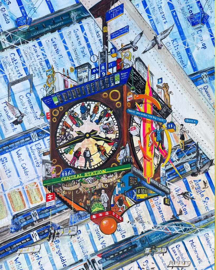 In Glasgow, we all know the phrase "Meet me under the clock." It’s what we say when we’re meeting friends, family, or loved ones off the train. This painting was created in January, just after the festive period—one of my favourite times of year because it means catching up with friends who’ve traveled home.