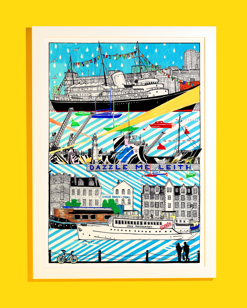Celebrate the vibrant maritime spirit of Edinburgh's waterfront with Dazzle Me Leith, an A3-sized print that beautifully captures the ships of Leith, including the famous Royal Yacht Britannia. This artwork also features the eye-catching Dazzle Ship by artist Ciara Phillips, along with the city's distinctive shoreline.