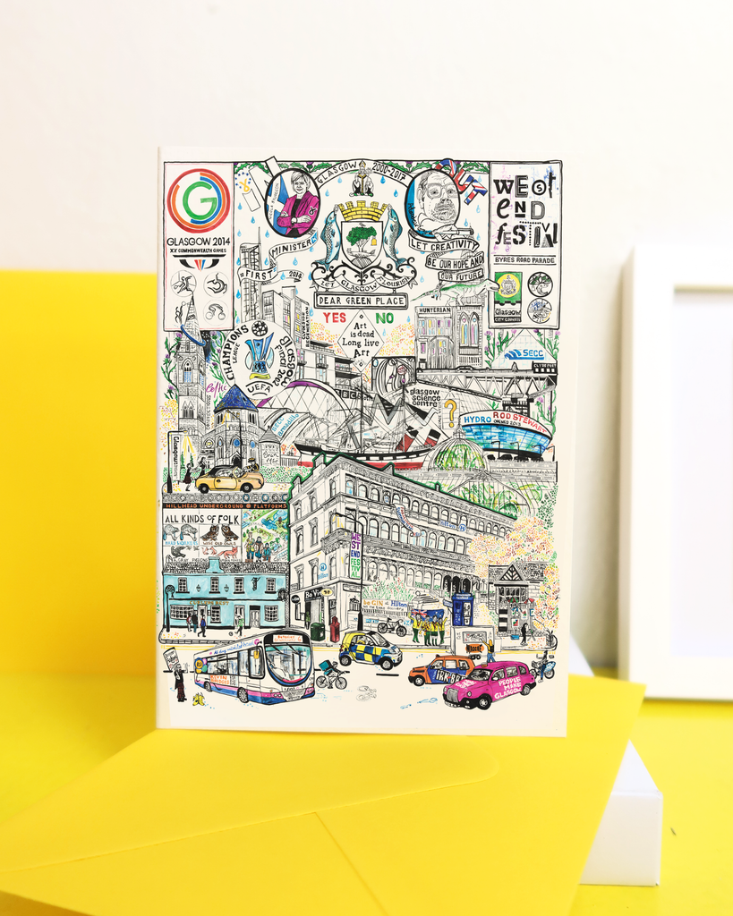This design in one of 4 that capture different moments in the history of Byres Road. This one is the most recent, starting in 2014. With nods to the referendum, Alasdair Gray mural, Oran More, opening of the Hydro and much more!
