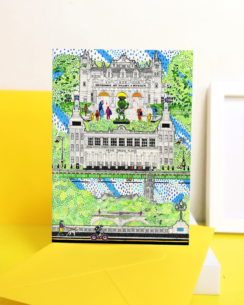 This card captures the three iconic buildings that rise above the lush trees of Kelvingrove Park—Kelvingrove Museum, Kelvin Hall, and the University of Glasgow. A tribute to the city’s rich history, stunning architecture, and beloved green spaces.