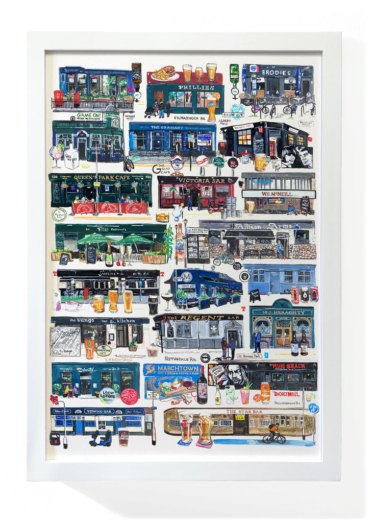 Immerse yourself in the world of Southside pubs with this artwork,  featuring a selection of 22 iconic establishments. This edition is a tribute to the joy and essence of the lively pub culture that thrives in the heart of the Southside.